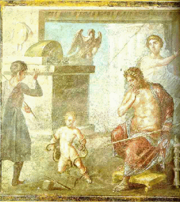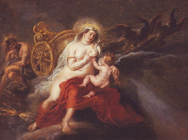 不知情的希拉餵了海克力斯乳汁,而宙斯因為心虛躲在後面。愚弄希拉的後果也使得海克力斯成為希臘神話中的悲劇英雄。