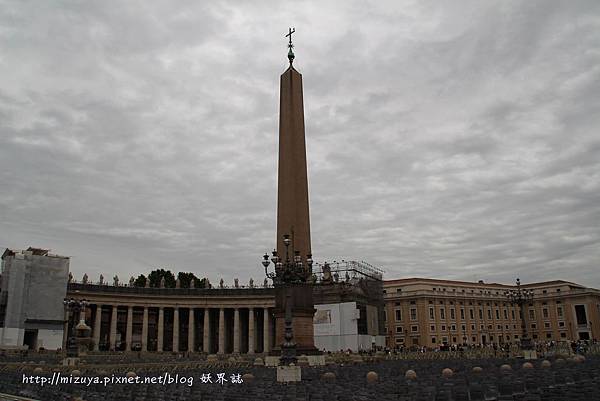 聖彼得廣場(Saint Peter's Square)的方尖碑。可惜天氣不好,雲層太厚了。聖彼得廣場是由義大利大師貝尼尼(Giovanni Lorenzo Bernini)建造,他設計了一個寬達240公尺的橢圓形大廣場來容納世界各地的信徒。